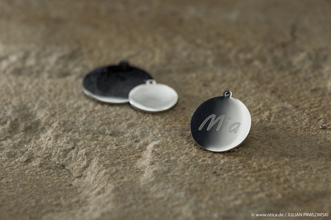 Auf der Vorderseite wird der Name eingraviert und auf der Rückseite die Handy oder Telefonnummer von Ihnen